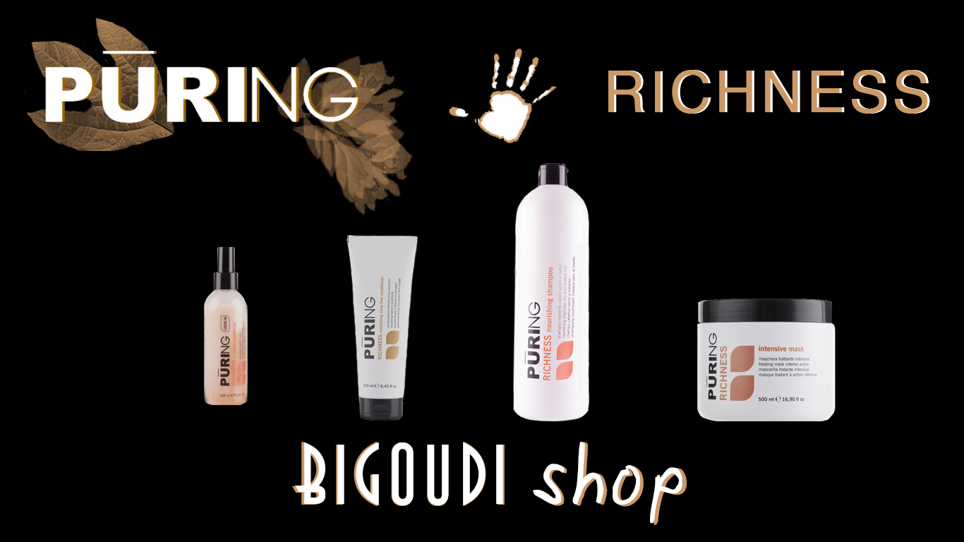 Bigoudi Shop vous propose la gamme Richness de Pūring, des produits destinés à nourrir parfaitement vos cheveux. En effet, leur composition est enrichie en huile d'amande douce, ainsi qu'en protéines de soie, de lait et de blé. Combinés ils permettent une nutrition complète de votre chevelure, ils améliorent aussi l'hydratation tout en protégeant les cheveux secs et traités.