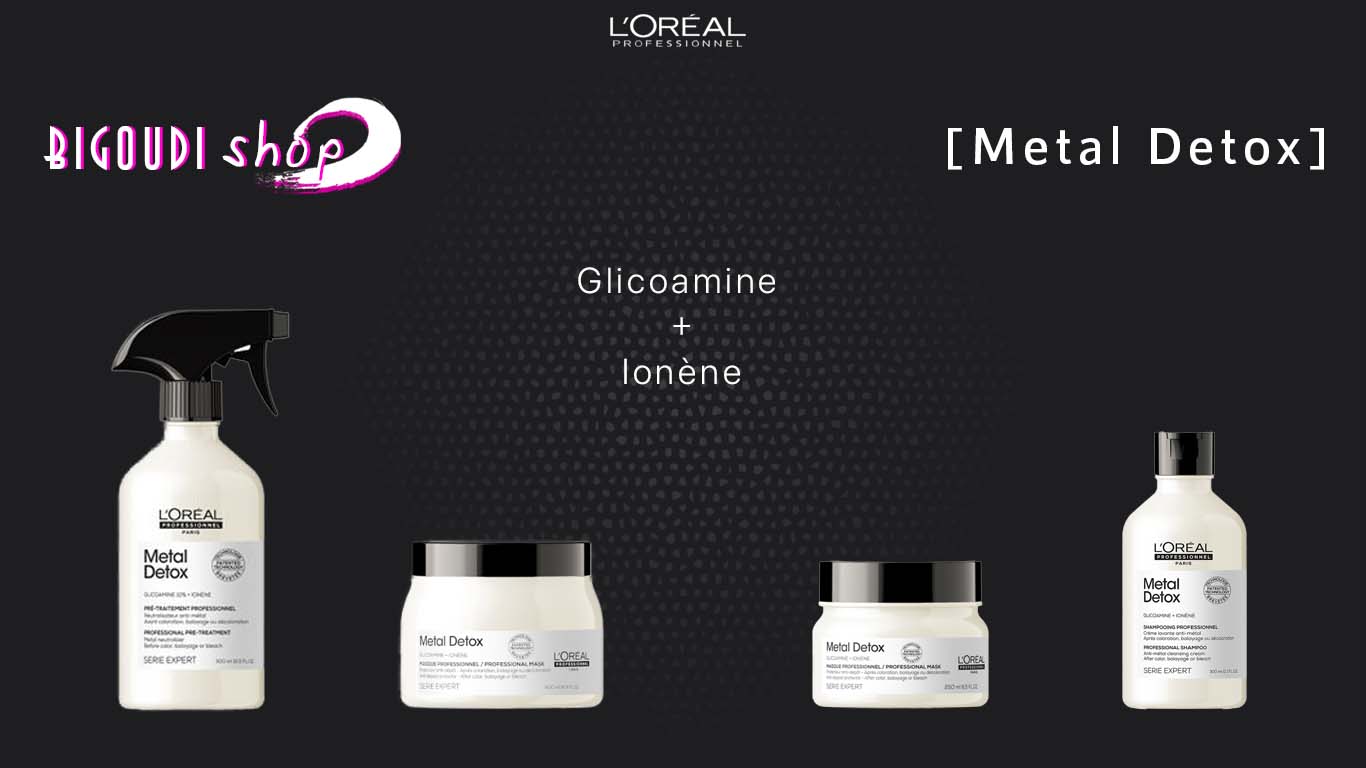 Retrouvez le spray pré-traitement [Metal-Detox] Série Expert 500ml, le masque traitant [Metal-Detox] Série Expert 250ml, ou au format 500ml, ainsi que le shampooing professionnel [Metal-Detox] Série Expert de l'Oréal Professionnel 300ml.
