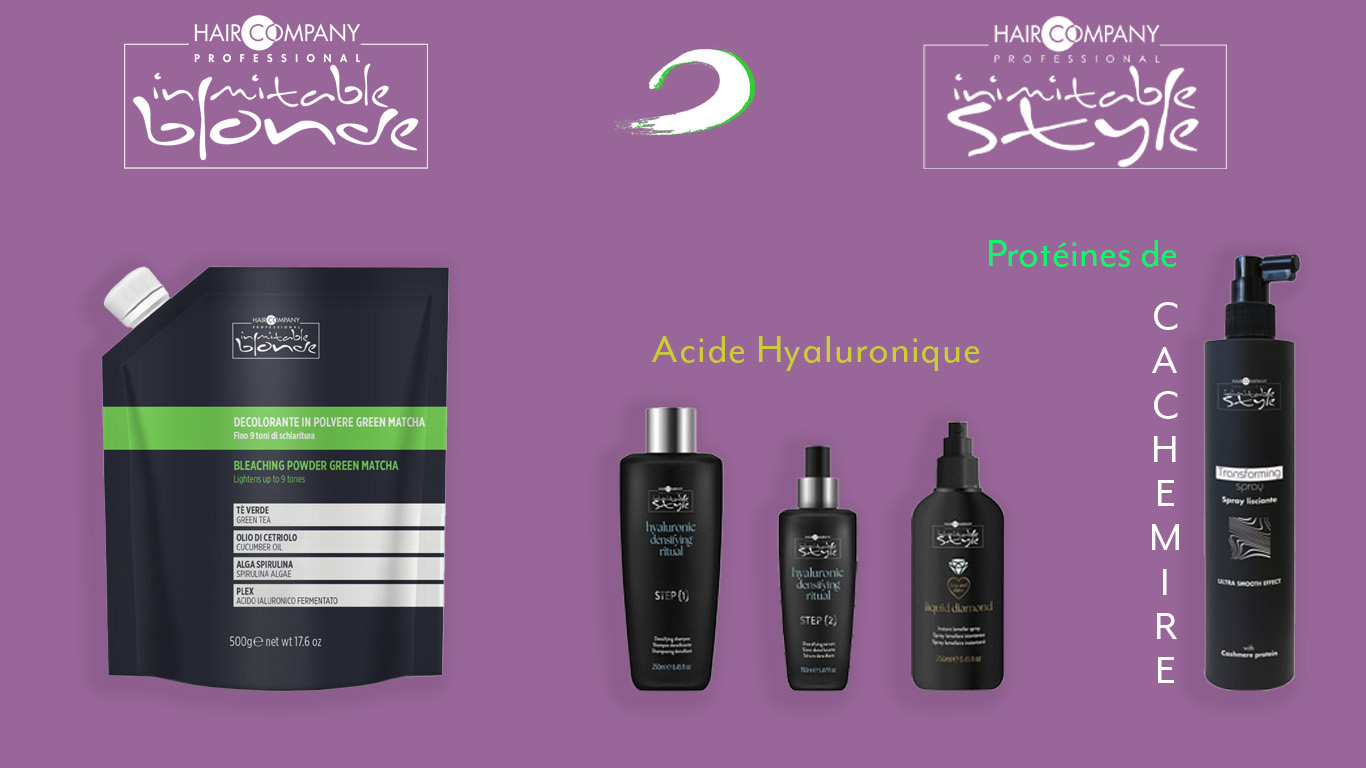 Bigoudi Shop vous propose désormais la gamme Inimitable Style de Hair Company ainsi que la poudre décolorante Green Matcha de la gamme Inimitable Blonde qui offre une décoloration pouvant aller jusqu'à 9 tons au-dessus de votre nuance actuelle tout en préservant au mieux la fibre capillaire.